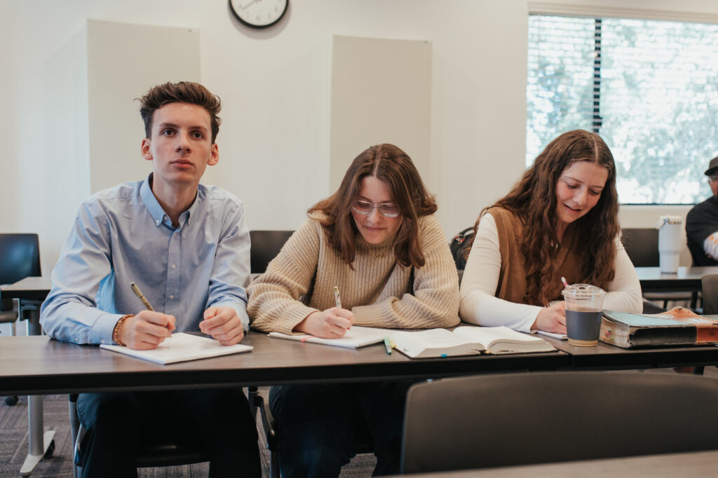 Rodrigo, Olivia, and Ana sit together during Dr. Abner Chou’s Hermeneutics course on the second floor of the Biblical Studies Center. This classroom was remodeled two years ago to add more technology and create a more effective learning space.