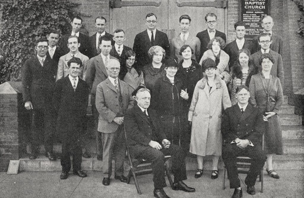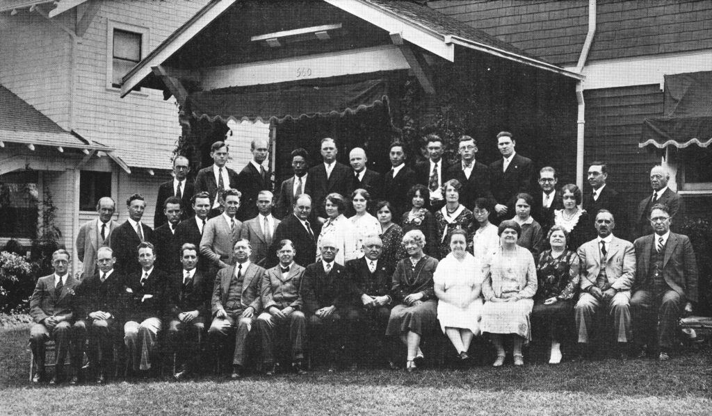 The faculty and first enrollment of students at Los Angeles Baptist Theological Seminary in October 1927. The school first met at Calvary Baptist Church in Los Angeles.