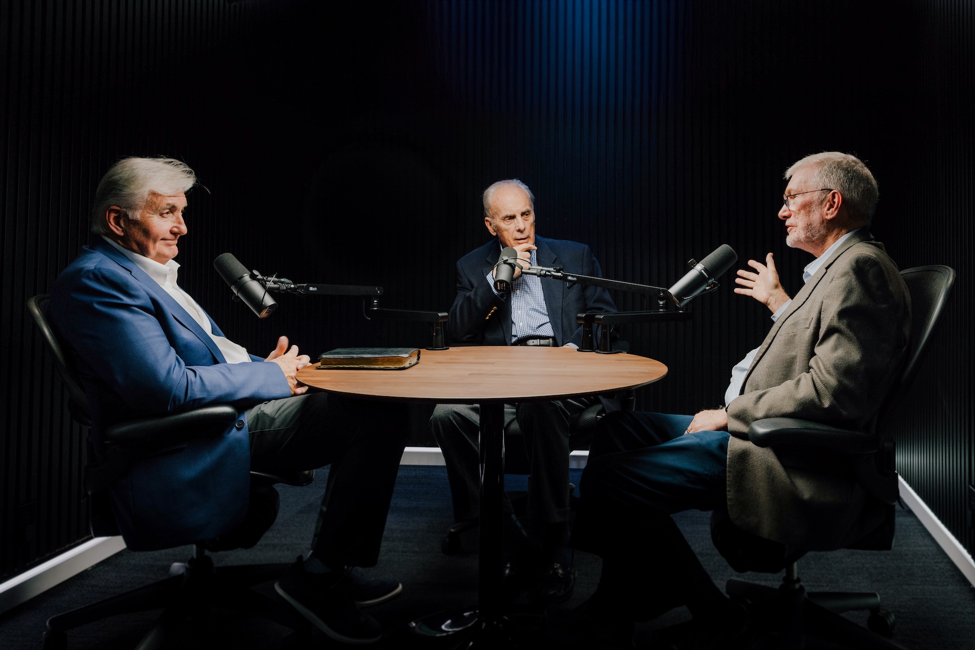 Campus Pastor Harry Walls, left, interviews Drs. John MacArthur and Ken Ham on an episode of The Art of Discernment. Photo by Mark Finster